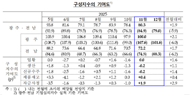 27일 한국은행 광주전남본부가 발표한 ‘2025년 11월 광주전남지역 기업경기조사 결과’에 따르면 제조업 기업심리지수(CBSI)는 80.3으로 전월(78.4) 대비 1.9포인트(p) 상승했다.
