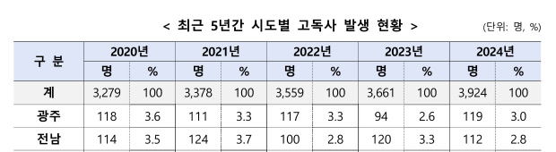 보건복지부가 최근 발표한 ‘2024 고독사 발생 실태조사’ 결과에 따르면 지난해 광주·전남 고독사 사망자 수는 231명으로, 전년(214명)보다 7.9% 증가했다. 같은 기간 광주는 94명에서 119명으로, 26.6% 고독사가 늘었다. 전남은 120명에서 112명으로 소폭 줄었다. 광주 고독사 증가율은 전국 평균 증가율 7.2%를 크게 웃돌았고, 서울(40.3%), 부산(27.9%)에 이어 17개 시·도 중 세 번째로 높았다. 광주·전남에서 쓸쓸히 임종한 이들은 2020년 232명, 2021년 235명, 2022년 217명, 2023년 214명, 지난해 231명 등으로 5년간 1129명에 달했다.