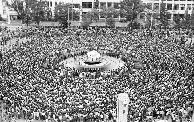 전두환이 ‘총칼’로 광주를 유린했다면 윤석열 정권은 아시아문화중심도시 조성위원회의 위상을 격하하려는 ‘법’을 악용해 국책사업을 고사시키는 등 교묘한 방식으로 ‘광주 지우기’를 답습했다는 지적이다. 1980년 5월 15일 전남도청 앞에 민주화를 열망하는 시민들이 구름처럼 운집한 모습. <광주일보 자료사진>