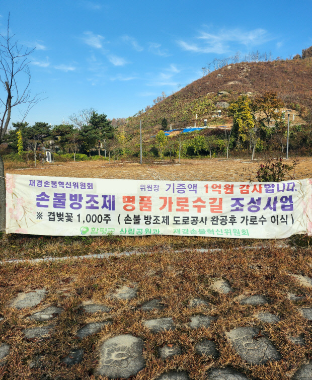 3일 함평군 등에 따르면 지난해 4월 출향 기업인 김모 씨가 손불면 방조제 도로에 겹벚꽃 나무 식재를 위해 1억원 기부를 약속하고, 우선 5000만 원이 입금된 본인 명의 통장을 군수에게 전달했다. 군은 기증패 수여식을 하고 통장은 업무 담당인 산림공원과장에게 이관해 가로수길 조성사업을 진행하기로 했다.