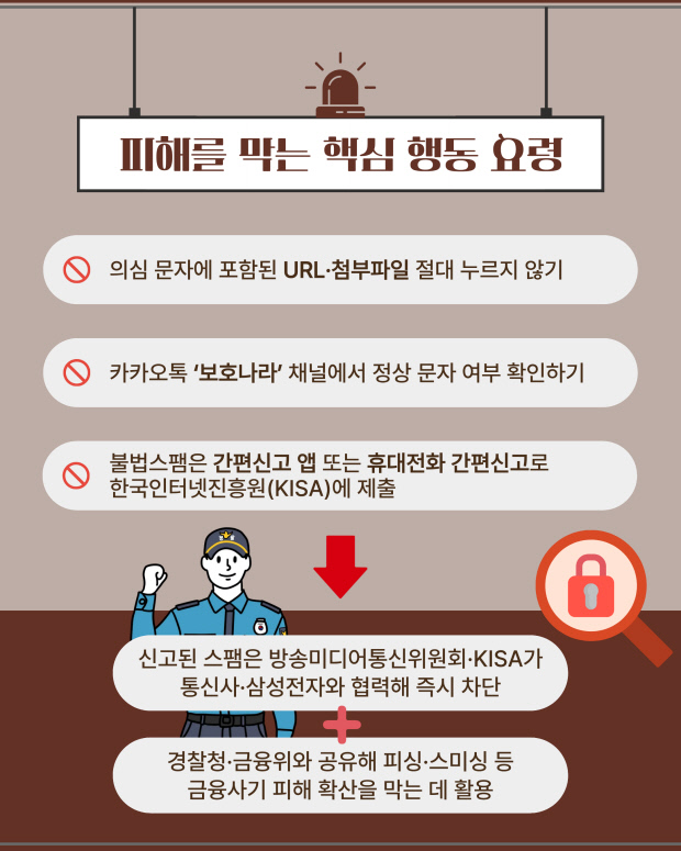 출처가 불분명한 미끼문자에 포함된 인터넷주소(URL)는 누르지 말고 전화도 받지 않아야 하며, 불법스팸을 받은 경우 해당 문자와 전자메일 등을 간편신고 앱과 휴대전화 간편신고 등을 통해 한국인터넷진흥원에 신고할 수 있다.