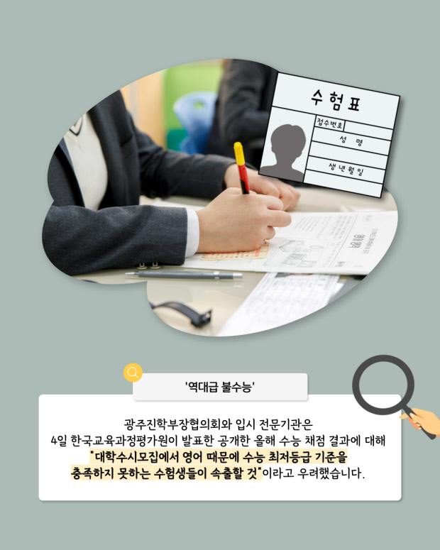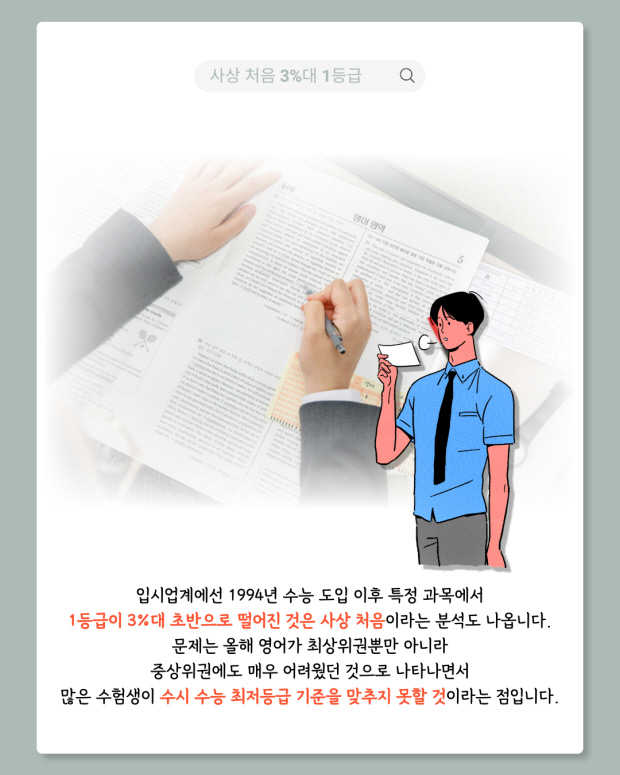 문제는 올해 영어가 최상위권뿐만 아니라 중상위권에도 매우 어려웠던 것으로 나타나면서 많은 수험생이 수시 수능 최저등급 기준을 맞추지 못할 것이라는 점입니다.