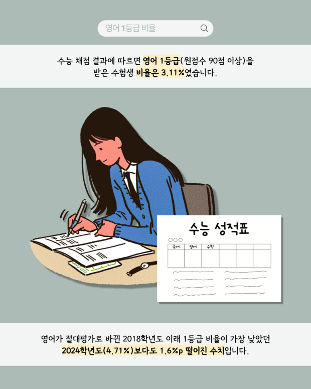 영어가 절대평가로 바뀐 2018학년도 이래 1등급 비율이 가장 낮았던 2024학년도(4.71%)보다도 1.6%p 떨어진 수치입니다.