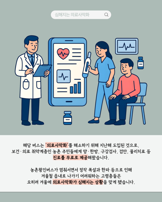 해당 버스는 ‘의료사막화’를 해소하기 위해 지난해 도입된 것으로, 보건·의료 취약계층인 농촌 주민들에게 양·한방, 구강검사, 검안, 물리치료 등 진료를 무료로 제공해왔습니다.
