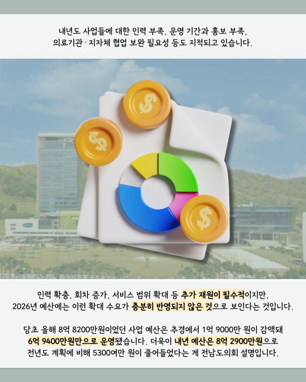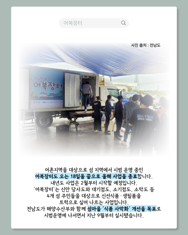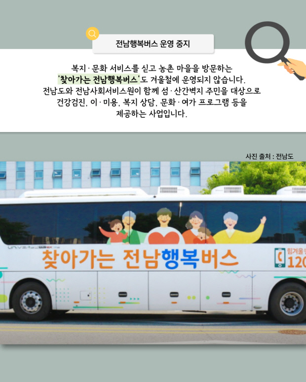 복지·문화 서비스를 싣고 농촌 마을을 방문하는 ‘찾아가는 전남행복버스’도 겨울철에 운영되지 않습니다. 전남도와 전남사회서비스원이 함께 섬·산간벽지 주민을 대상으로 건강검진, 이·미용, 복지 상담, 문화·여가 프로그램 등을 제공하는 사업입니다.