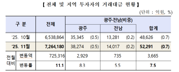 | 2025년 11월 전국 및 광주·전남 투자자 거래대금 현황 표<한국거래소 광주혁신성장센터 제공> |