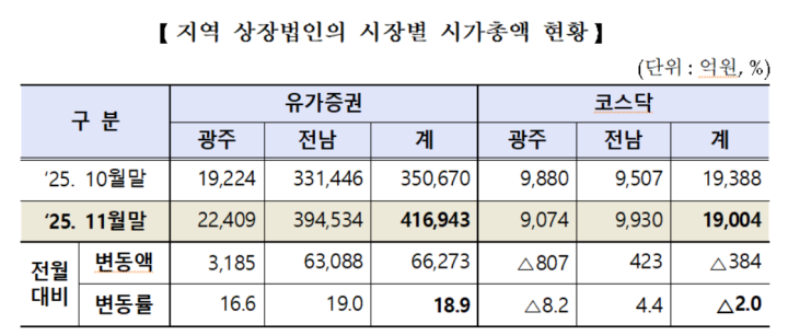 | 2025년 광주·전남지역 상장법인 시가총액 현황 표<한국거래소 광주혁신성장센터 제공> |