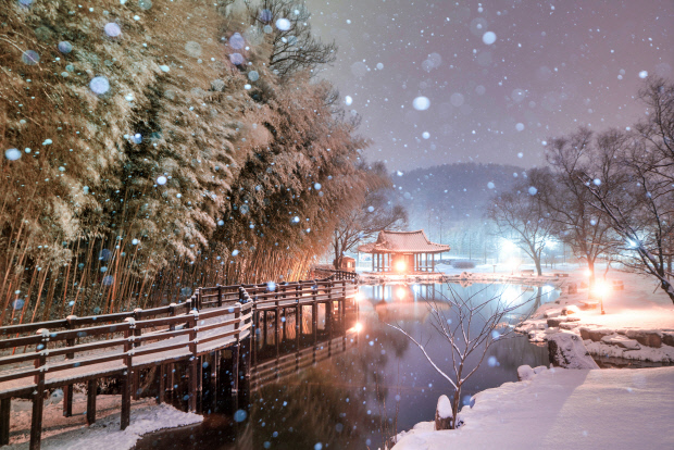 가을만큼 풍성하진 않지만 눈 내린 뒤 찾는 다면 동화 같은 풍경을 만날 수 있는 곳이 유럽풍 마을인 담양 메타프로방스다. 메타세쿼이아 길 양 옆으로 쌓인 눈과 바로 옆 카페 거리 조명 등과 어우러져 이색적 겨울 풍경을 접하게 된다.