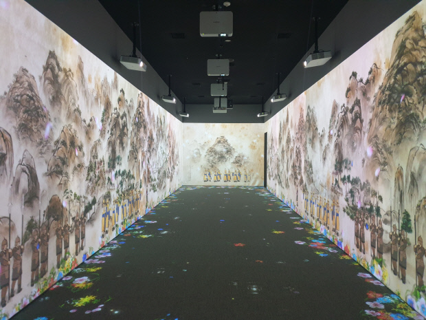 ◇팔만대장경의 이동, 화면 속 여정을 따라가다= 가장 많은 관람객이 머무는 공간은 팔만대장경을 해인사까지 옮기는 과정을 구현한 실감형 미디어아트 전시다. 대형 스크린에 펼쳐진 장면은 관람객의 움직임에 반응하며 이어지고, 화면 속 인물과 행렬은 실제 이운 과정을 따라 천천히 이동한다.