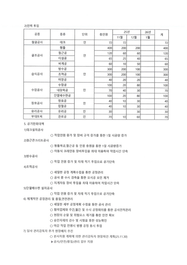 다만 실제 인원 투입은 원활하지 않았던 것으로 전해졌다. 감리 측은 “11월부터 인원을 늘리겠다고 충원요청을 했지만 계획대로 진행되지 않아 충원되지 않은 채로 공사가 진행했다”며 “투입 계획 상 월별 200명, 100명 단위로 투입하겠다고 했으나 충족이 안 된 상태였다”고 밝혔다.