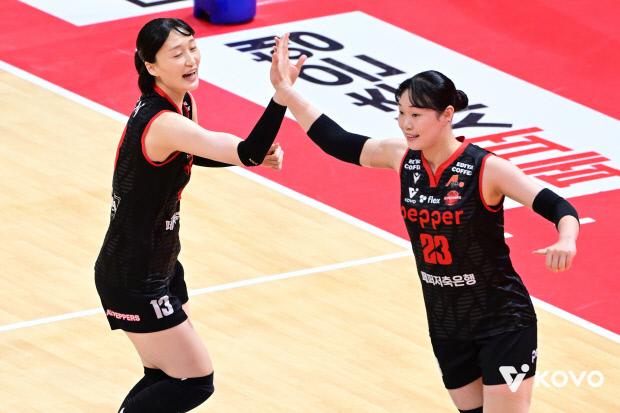 페퍼스의 세터 이원정이 지난 17일 페퍼스타디움에서 열린 V리그 3라운드 IBK기업은행과의 맞대결을 통해 부상 복귀전을 치렀다. 지난 시즌 마지막 경기에서 아웃사이드 히터 박은서와 하이파이브를 하고 있는 이원정(오른쪽). <KOVO 제공>