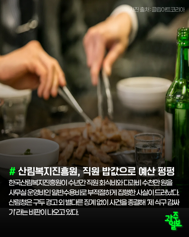 한국산림복지진흥원이 수년간 직원 회식비와 다과비 수천만 원을 사무실 운영비인 일반수용비로 부적절하게 집행한 사실이 드러났다. 산림청은 구두 경고 외 별다른 징계 없이 사건을 종결해 ‘제 식구 감싸기’라는 비판이 나온다.