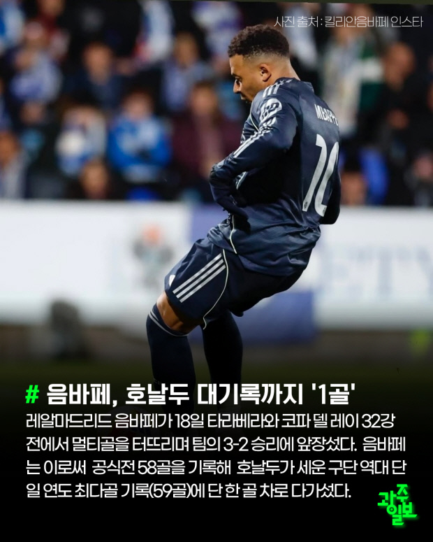레알마드리드의 음바페가 18일 타라베라와 코파 델 레이 32강전에서 멀티골을 터뜨리며 팀의 3-2 승리에 앞장섰다. 음바페는 이로써 공식전 58골을 기록해 호날두가 세운 구단 역대, 단일 연도 최다골 기록(59골)에 단 한 골 차로 다가섰다.