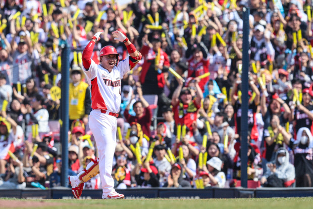 KIA가 내년 3월 28일 문학에서 SSG를 상대로 2026시즌 개막전을 치른다. 지난 3월 22일 챔피언스필드에서 열린 NC와의 2025시즌 개막전에서 적시타를 친 뒤 기뻐하는 김태군. <KIA 타이거즈 제공>
