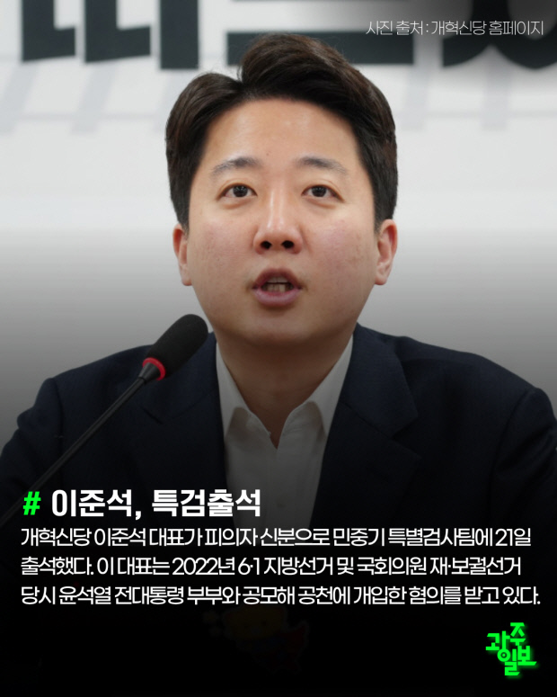 개혁신당 이준석 대표가 피의자 신분으로 민중기 특별검사팀에 21일 출석했다. 이 대표는 2022년 6·1 지방선거 및 국회의원 재·보궐선거 당시 윤석열 전대통령 부부와 공모해 공천에 개입한 혐의를 받고 있다.