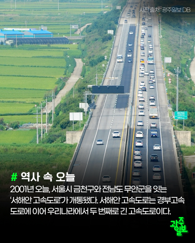 2001년 오늘, 서울시 금천구와 전남도 무안군을 잇는 ‘서해안 고속도로’가 완전 개통됐다. 서해안 고속도로는 경부고속도로에 이어 우리나라에서 두 번째로 긴 고속도로이다.