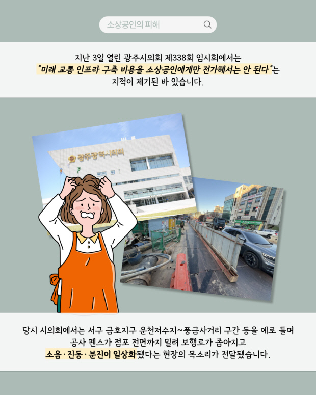 지난 3일 열린 광주시의회 제338회 임시회에서는 “미래 교통 인프라 구축 비용을 소상공인에게만 전가해서는 안 된다”는 지적이 제기된 바 있습니다.
