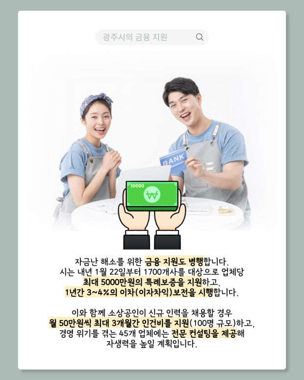 이와 함께 소상공인이 신규 인력을 채용할 경우 월 50만원씩 최대 3개월간 인건비를 지원(100명 규모)하고, 경영 위기를 겪는 45개 업체에는 전문 컨설팅을 제공해 자생력을 높일 계획입니다.