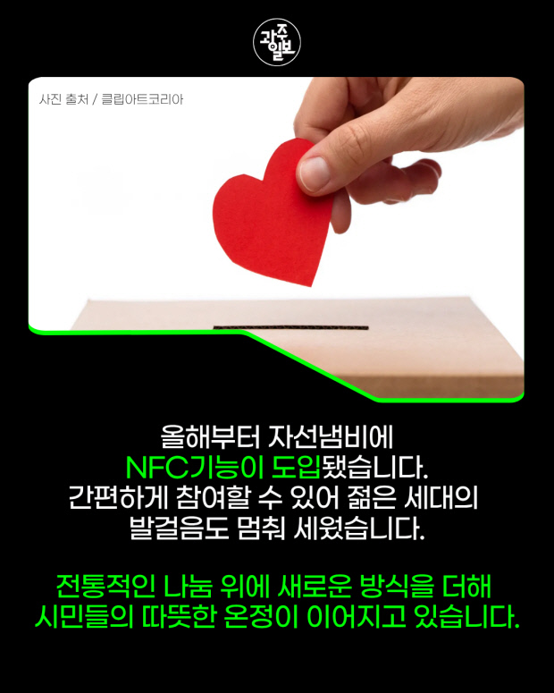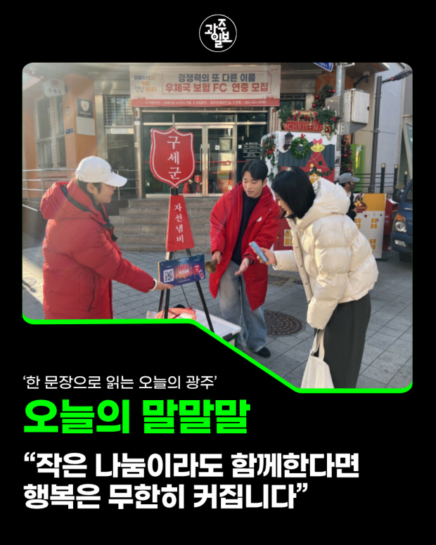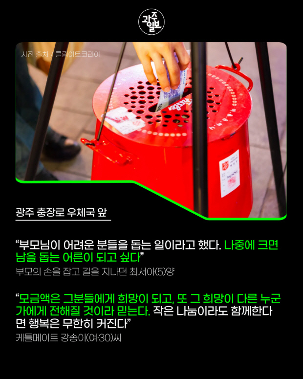 한편 구세군은 올해 전국 275곳에 자선냄비를 설치했으며, 광주에서는 오는 24일까지 충장로, 서구 광천종합버스터미널, 광산구 수완지구 등 3곳에서 거리 모금을 진행한다.