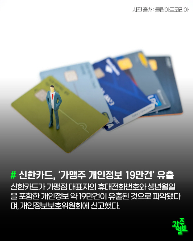 신한카드가 가맹점 대표자의 휴대전화번호와 생년월일을 포함한 개인정보 약 19만건이 유출된 것으로 파악됐다며, 개인정보보호위원회에 신고했다.
