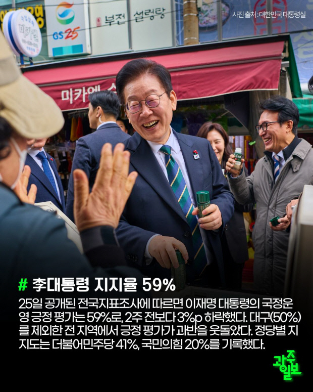 25일 공개된 전국지표조사에 따르면 이재명 대통령의 국정운영 긍정 평가는 59%로, 2주 전보다 3%p 하락했다. 대구(50%)를 제외한 전 지역에서 긍정 평가가 과반을 웃돌았다. 정당별 지지도는 더불어민주당 41%, 국민의힘 20%를 기록했다.