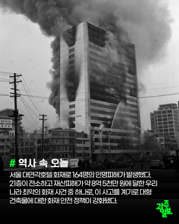 서울 대연각호텔 화재로 164명의 인명피해가 발생했다. 21층이 전소하고 재산피해가 약 8억 5천만 원에 달한 우리나라 최악의 화재 사건 중 하나로, 이 사고를 계기로 대형 건축물에 대한 화재 안전 정책이 강화됐다.