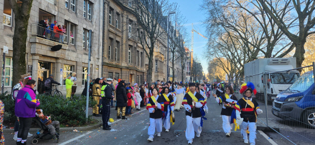 | ‘광주 학생 글로벌 리더 세계 한 바퀴’ 프로그램에 참가한 학생들이 독일 뒤셀도르프 글리세 로젠몬탁 카니발에서 행진하고 있다. |