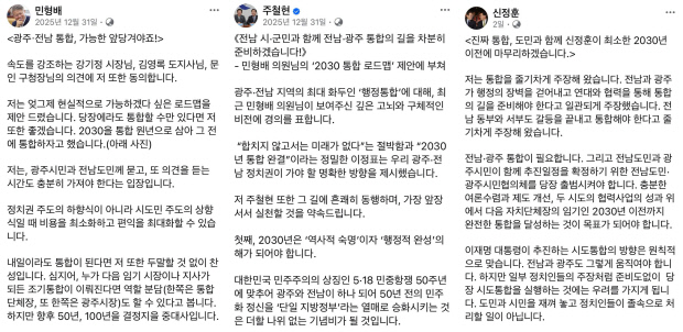 논란의 핵은 통합 시점이다. 전남지사 후보인 주철현(여수갑) 의원과 민형배 의원은 “2030년 원년”을 주장하며 속도 조절을 외치고 있다.