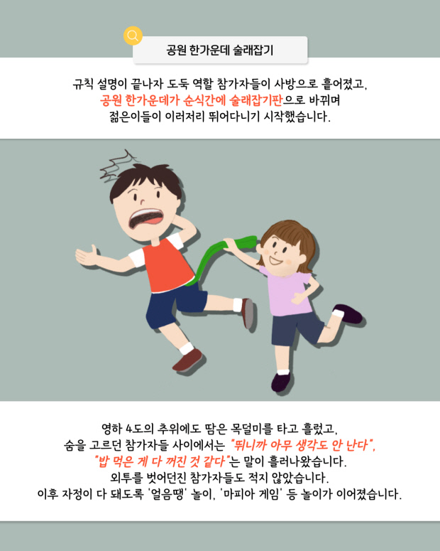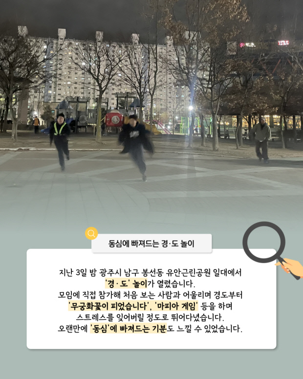 지난 3일 밤 광주시 남구 봉선동 유안근린공원 일대에서 ‘경·도(경찰과 도둑)’ 놀이가 열렸습니다. 모임에 직접 참가해 처음 보는 사람과 어울리며 경도부터 ‘무궁화꽃이 피었습니다’, ‘마피아 게임’ 등을 하며 스트레스를 잊어버릴 정도로 뛰어다녔습니다. 오랜만에 ‘동심’에 빠져드는 기분도 느낄 수 있었습니다.