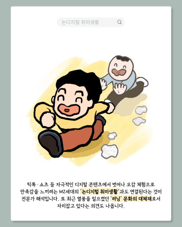 ‘경·도’놀이는 틱톡·쇼츠 등 자극적인 디지털 콘텐츠에서 벗어나 오감 체험으로 만족감을 느끼려는, MZ세대의 ‘논디지털 취미생활’과도 연결된다는 것이 전문가 해석입니다. 또 최근 열풍을 일으켰던 ‘러닝’ 문화의 대체재로서 자리잡고 있다는 의견도 나옵니다.