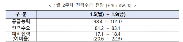 1월 2주차(1월 5~9일) 전력 수요는 81.2~83.1GW로 전망됐다. 예비력 17.1~18.4GW, 예비율 20.6~22.3%로 전력 공급은 안정적일 것이라는 게 전력거래소의 설명이다.