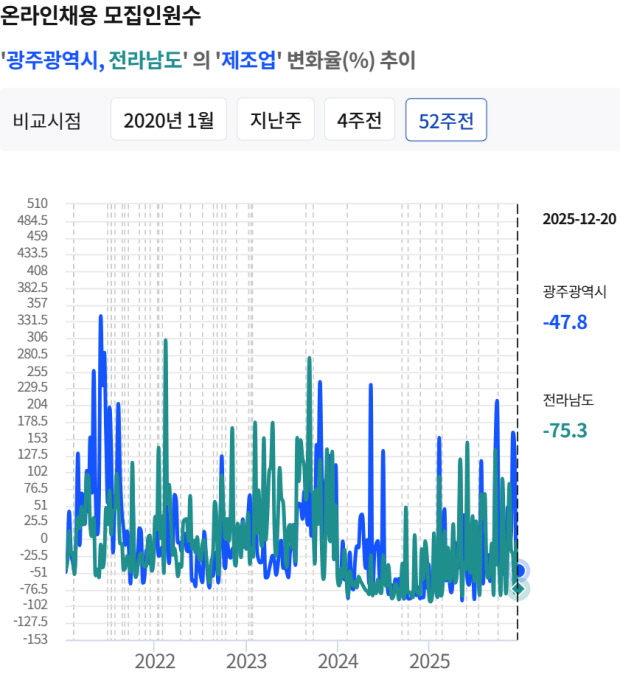 같은 기간 전남 제조업 부문 채용 모집인원 감소율(75.3%)은 전국 17개 시·도 가운데 가장 높았다. 이어 전북(57.2%), 광주(47.8%) 등이 뒤를 이었다. 전국 평균 제조업 채용 공고 증가율은 100.5%로, 1년 새 공고가 늘어난 지역은 제주(450%), 충북(295.9%), 인천(117.8%), 대전(96.4%), 서울(1.8%) 등 5곳이었다.