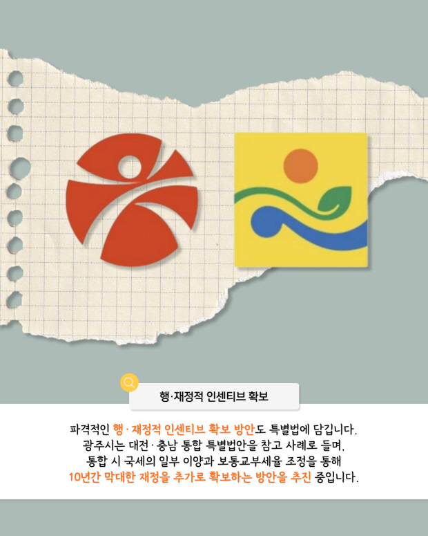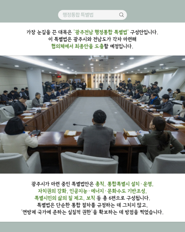 광주시가 마련 중인 특볍법안은 총칙, 통합특별시 설치·운영, 자치권의 강화, 인공지능·에너지·문화수도 기반조성, 특별시민의 삶의 질 제고, 보칙 등 총 6편으로 구성됩니다.