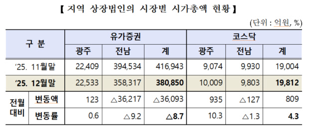 8일 한국거래소 광주혁신성장센터가 발표한 ‘2025년 12월 광주·전남 주식거래실적’에 따르면 광주·전남 상장법인 38개사 시총은 지난해 12월 말 기준 40조 662억원으로 전월 대비 3조 5285억원(8.1%) 감소했다. 지역 상장법인 전체 시총의 75%를 차지하는 한전의 시총이 1달 새 3조 4024억원 떨어져 전체 감소분의 96.4%를 차지했다.
