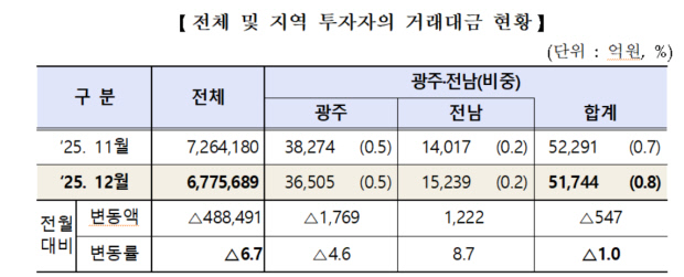| 2025년 12월 광주·전남지역 투자자 주식 거래대금 현황 표.<한국거래소 광주혁신성장센터 제공> |