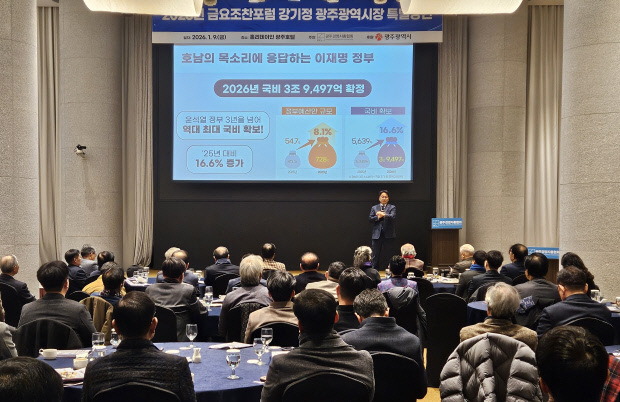강 시장은 ‘광주·전남 대통합 부강한 광주의 확장’을 주제로 강연을 시작해 역대 최대 규모의 국비 확보 성과를 공유하고 행정 통합 필요성을 강조했다.