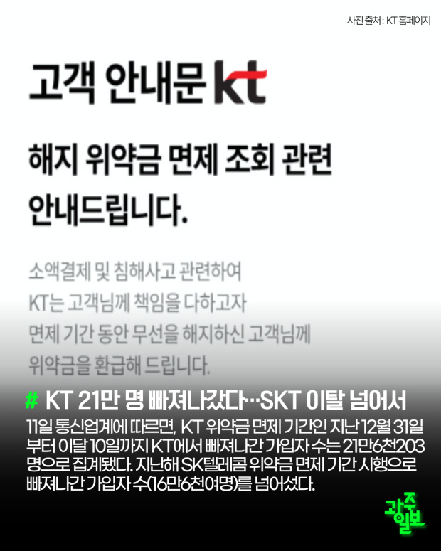 11일 통신업계에 따르면, KT 위약금 면제 기간인 지난 12월 31일부터 이달 10일까지 KT에서 빠져나간 가입자 수는 21만6천203명으로 집계됐다. 지난해 SK텔레콤 위약금 면제 기간 시행으로 빠져나간 가입자 수(16만6천여명)를 넘어섰다.