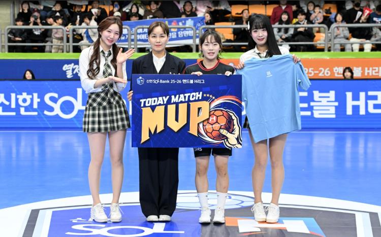 | 이날 경기 MVP로 선정된 SK슈가글라이더즈 김하경, 시상자는 임오경 국회의원(민주당·경기 광명갑). <핸드볼 연맹 제공> |
