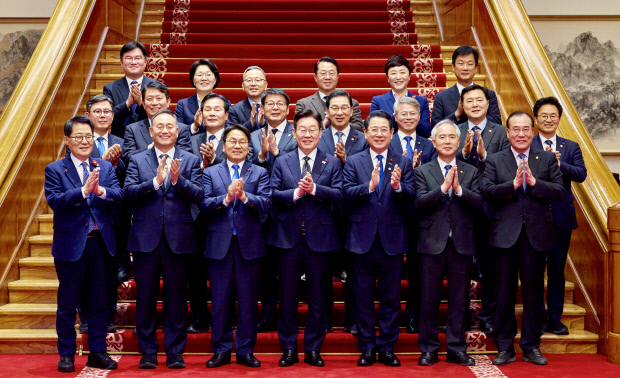 이재명 대통령이 지난 9일 광주·전남 행정통합과 관련해 청와대 오찬 간담회에 참석한 강기정 광주시장과 김영록 전남지사, 지역 국회의원들과 함께 기념촬영을 하고 있다. <청와대제공>