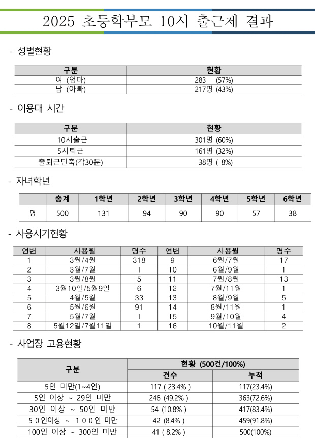‘10시 출근제’를 이용한 500건의 사례를 보면 엄마 근로자가 57%(283명)를 차지했고, 1학년 학부모 근로자(26.2%·131명)가 가장 많이 이 제도를 사용했다. 이용 시간은 10시 출근이 60%(301명)를 차지하며 가장 많았고, 5시 퇴근(32%), 각 30분 출퇴근 단축(8%)이 뒤를 이었다. 사용 시기는 입학 초기인 3~4월(63.6%·318명)에 몰렸고, 30인 미만 사업장의 사용(72.6%)이 주를 이뤘다. 사업장 업종을 보면 제조업이 33.2%(166곳)로 가장 많았고 금융·교육·이미용·요식 등 서비스(30.2%), 도·소매업(13.6%), 토목·조경 등 건설업(13%) 등 순이었다.
