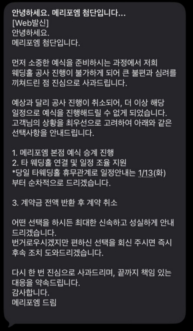 업체 측이 계약자들에게 보낸 문자에는 ‘공사 진행이 취소돼 더 이상 해당 일정으로 예식을 진행할 수 없게 됐다’는 문구가 포함된 것으로 확인됐다.