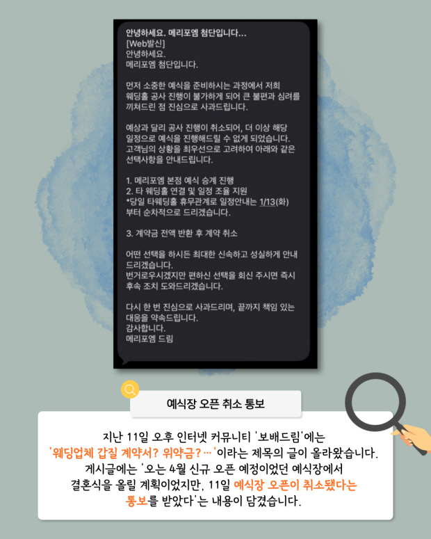 지난 11일 인터넷 커뮤니티 ‘보배드림’에는 ‘웨딩업체 갑질 계약서? 위약금?…’이라는 제목의 글이 올라왔다. 글 작성자는 해당 예식장에서 결혼식을 올릴 계획이었지만, 업체로부터 오픈 취소 통보를 받았다고 밝혔다.