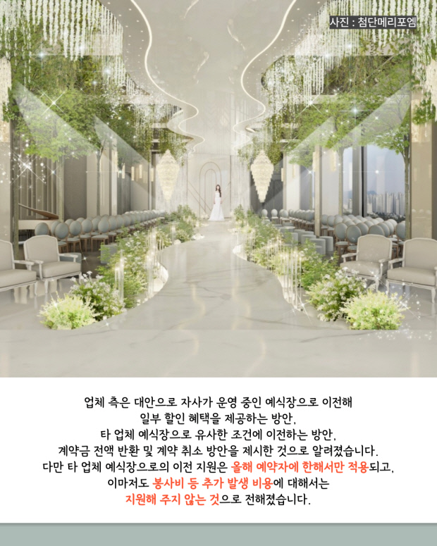 갑작스러운 취소에 업체는 대안으로 자사가 운영 중인 예식장으로 이전해 일부 할인 혜택을 제공하는 방안, 타 업체 예식장으로 유사한 조건에 이전하는 방안, 계약금 전액 반환 및 계약 취소 방안을 제시한 것으로 알려졌다. 다만 타 업체 예식장으로의 이전 지원은 올해 예약자에 한해 적용되며, 봉사비 등 추가 발생 비용은 지원하지 않는 것으로 알려졌다.