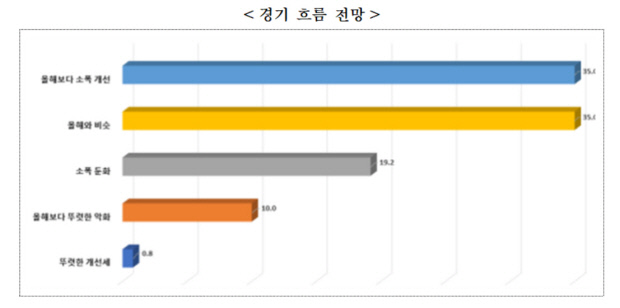 응답 기업의 35%는 올해 경기 흐름을 ‘전년보다 소폭 개선’할 것이라고 답변했다. ‘전년과 비슷’(35%), ‘소폭 둔화’(19.2%), ‘뚜렷한 악화’(10.0%) 등이 뒤를 이었다. 기업이 급격한 경기 반등보다 완만한 회복 또는 정체 국면을 예상하는 것으로 보인다.