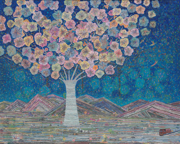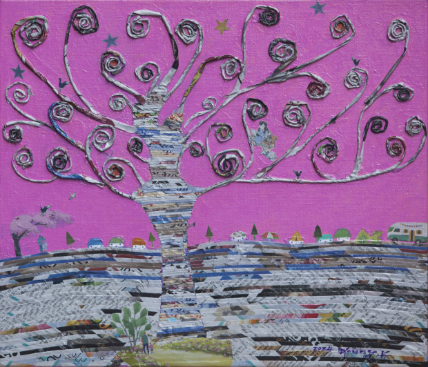 ‘행복나무’는 그림을 보는 것만으로도 잔잔한 미소를 짓게 한다. 작품에 투영된 행복의 이미지는 잔잔하면서도 은은하며, 결코 시간에 침윤되지 않는 본질적인 분위기를 환기한다. 행복나무를 중심으로 펼쳐진 시골의 풍경, 달리는 버스, 옹기종기 모여 있는 작은 집들 그리고 이 모든 풍경을 떠받치고 있는 ‘삶의 지층’은 무엇에도 흔들리지 않는 단단한 토대로 다가온다.