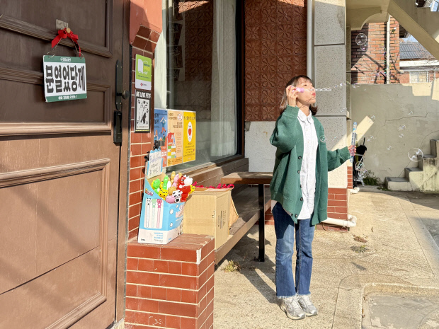 | 비눗방울을 부는 책방지기 이혜미 씨의 모습. |