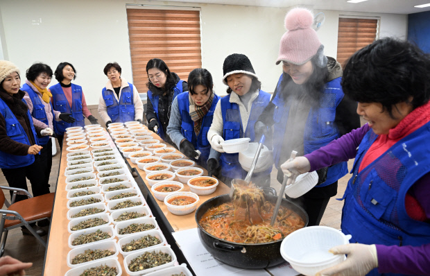 14일 광주 북구 용봉동 행정복지센터에서 열린 사랑의 반찬 나눔 행사에서 직원과 자원봉사캠프지기들이 독거노인과 취약계층 등 지역 돌봄이웃 30세대에 전달할 직접 만든 밑반찬과 육계장을 포장하고 있다. /나명주 기자 mjna@