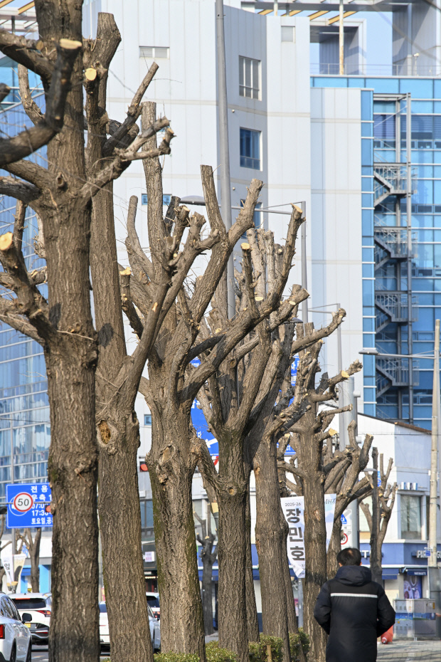 14일 오후 광주시 동구 제봉로 동구청 앞 교차로의 가로수에 가지치기 작업이 진행된 가운데, 가지가 모두 잘려 나간 나무들이 앙상한 모습으로 줄지어 서 있다. /김진수 기자 jeans@kwangju.co.kr
