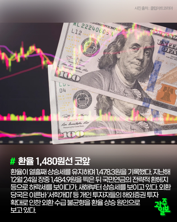 환율이 열흘째 상승세를 유지하며 1,478.3원을 기록했다. 지난해 12월 24일 장중 1,484.9원을 찍은 뒤 국민연금의 전략적 환헤지 등으로 하락세를 보이다가, 새해부터 상승세를 보이고 있다. 외환 당국은 이른바 ‘서학개미’ 등 개인 투자자들의 해외증권 투자 확대로 인한 외환 수급 불균형을 환율 상승 원인으로 보고 있다.