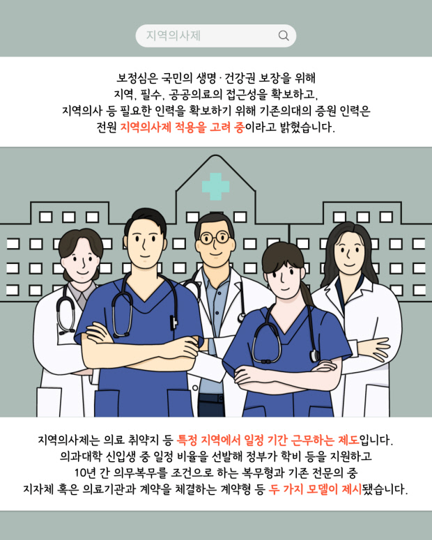 보정심은 국민 건강권 보장을 위해 지역·필수·공공의료 접근성을 강화하고, 의대 증원 인력을 전원 지역의사제로 운영하는 방안을 검토 중이다. 지역의사제는 의료 취약지에서 일정 기간 근무하는 제도로, 학비 지원과 10년 의무복무를 조건으로 하는 복무형과 계약형 모델이 제시됐다.